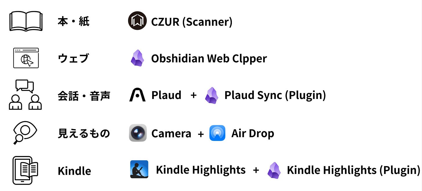 この図にないものとしては「ポッドキャスト」と「はてなブックマーク」と「過去に書いたブログ」のデータも取り込んで使っています。