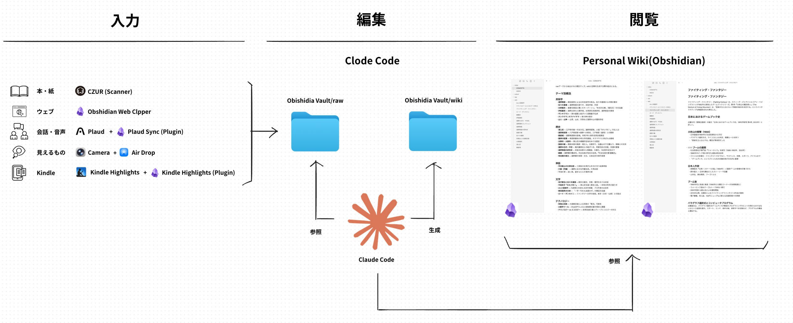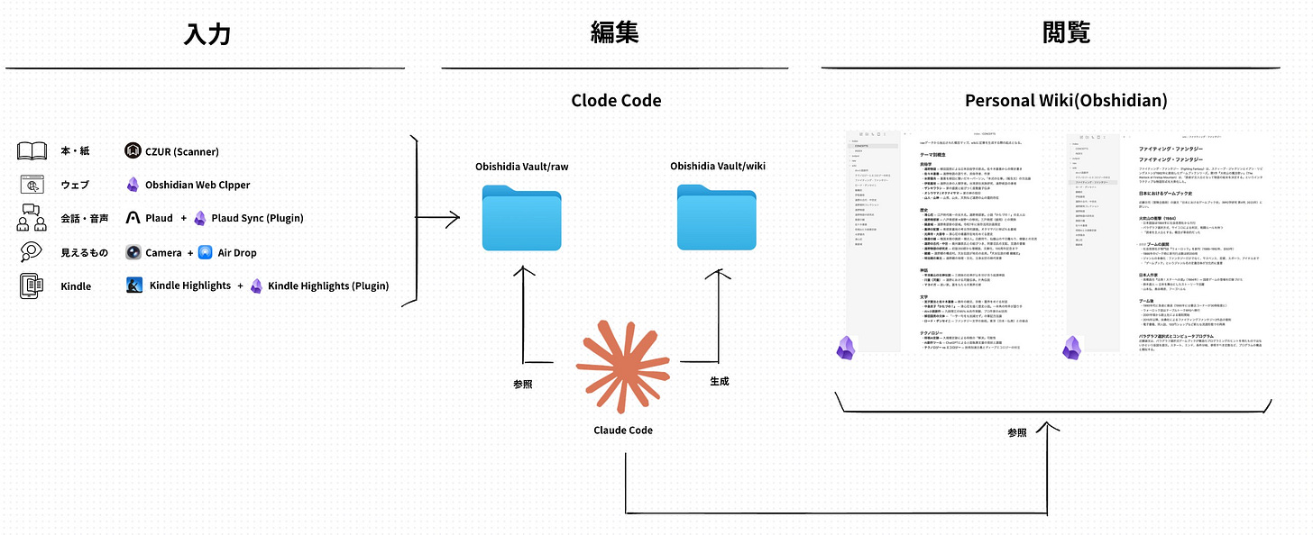 自分が見聞きしたものをほとんどすべて「raw」フォルダに放り込んで、それをもとにClaude Codeで「wiki」フォルダをつくる。そして、Claude Codeを対話して、その会話を「output」フォルダに保存する。