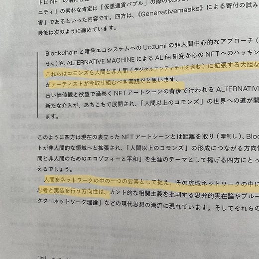 該当部分は以下の通りですが、簡単に言うと、いまのDecentralizedは人間中心主義の考え方の枠に収まったものでしかなく、非人間(たとえば植物や動物などを想像してみましょう)も含めた世界で人間を一要素に落としたうえで本当の分散を考えたらどうなるか、という考えを誘惑するものです。