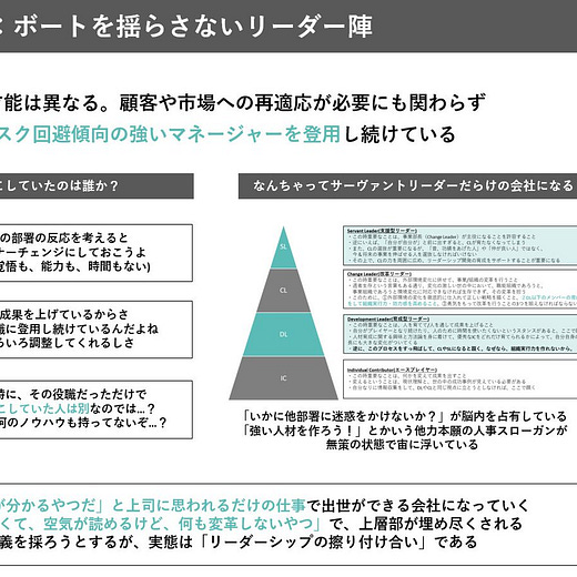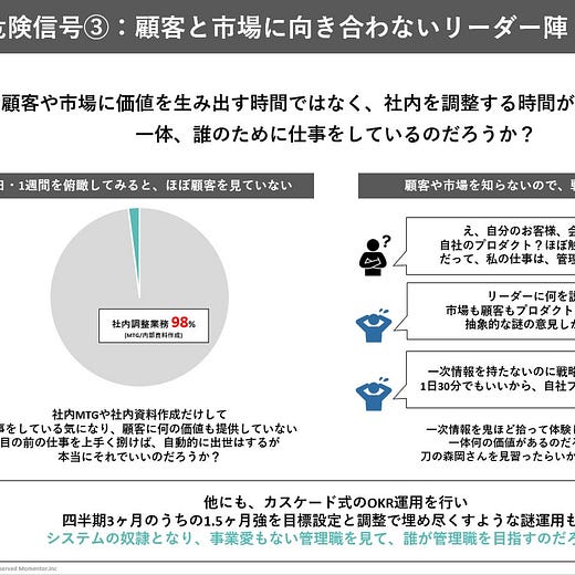 カスケード式のOKR運用を行い四半期3ヶ月のうち1.5ヶ月を目標設定と調整で埋め尽くすような謎運用。システムの奴隷となり、事業愛もない管理職を見て、誰が管理職を目指すのだろうか?